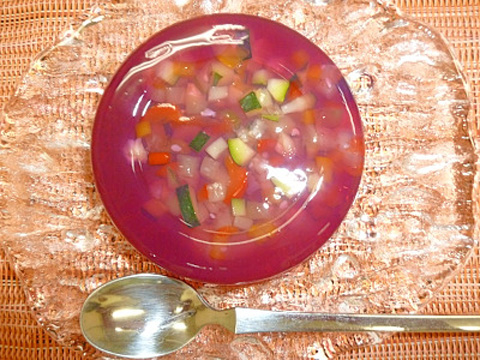 ジュースに寒天を混ぜ、火にかけよくとけるまで煮る。